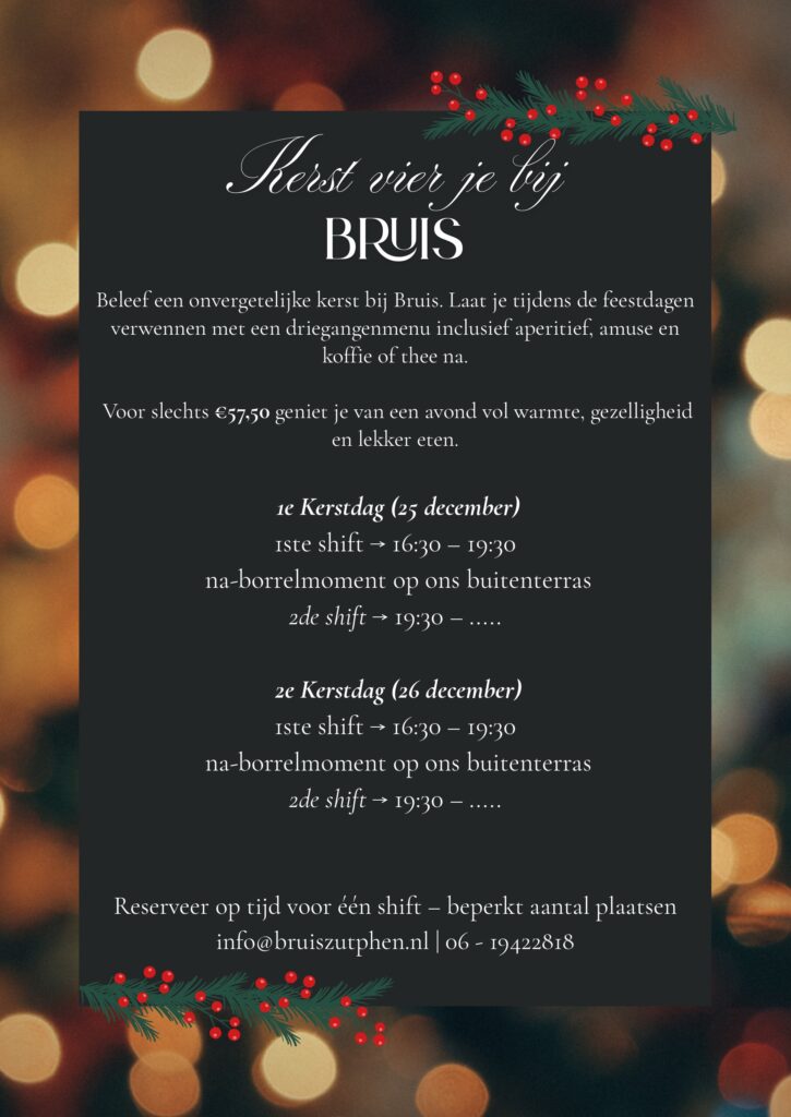 Let op: wij beschikken over een beperkt aantal plaatsen, dus als u wil genieten van een kerstdiner bij Bruis raden wij u aan om tijdig te reserveren via: